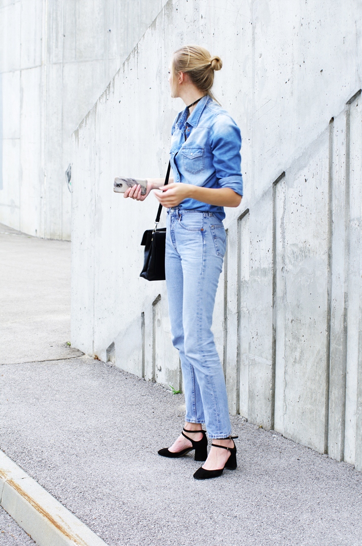 Double denim strikes again. 90’s vibes again! I live for double denim back then, a bit of Levi’s and a huge denim jacket. Probably my next outfit, yes, ha! So chokers are so popular right now, who would have thought. I remember back then when those stretchy children chokers were very hip. I prefer the current version if I am honest. And you can find a billion version everywhere. I went to give this casual widthone a try. And now I am in the search for the double one. You can easily make it as a DIY project, no problem! Just some shoe laces… I did a DIY here on the blog a while back!